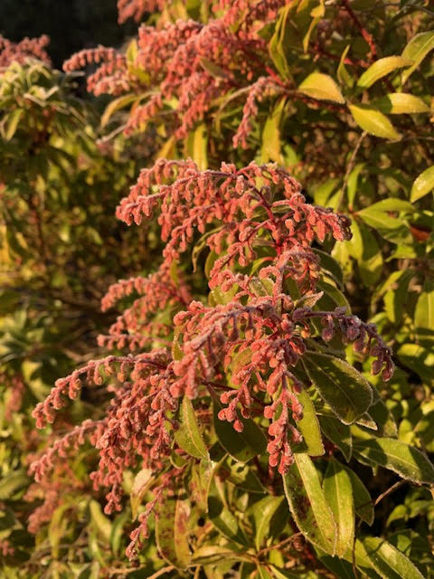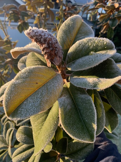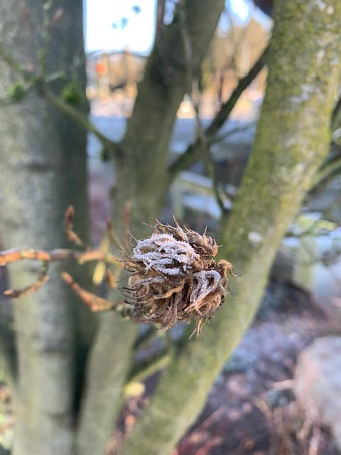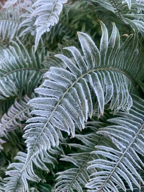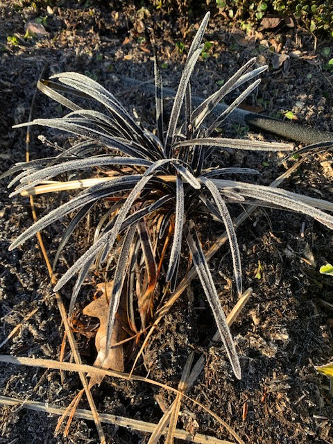 Tall ornamental grasses, like Miscanthus and Calamagrostis, look great with their flower spikes covered in frost. Sadly, idiots robbed us of a good show.