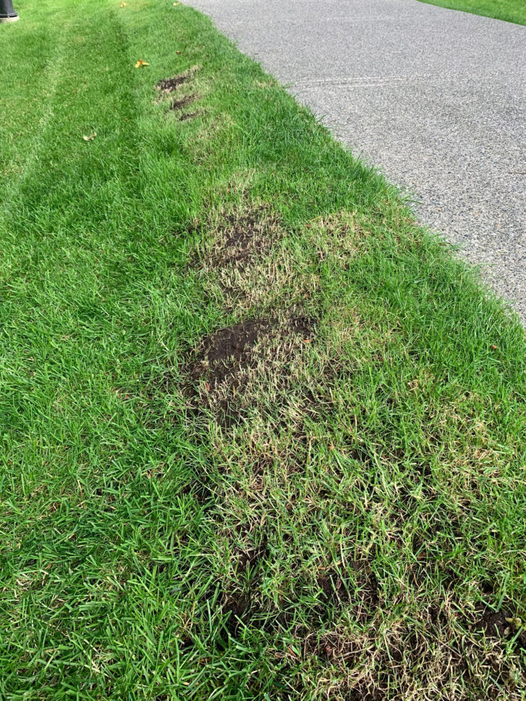 Now, in the example above we got lucky because the scalp happened on a piece of new sod. The grass around the scalps pushed up nicely and obscured the damage.